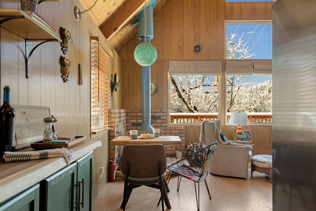 Welcome to Inspiration Cabin, a cozy retro-inspired A-frame chalet. Unwind while enjoying a glass of wine or a mug of hot cocoa in front of the original vintage wood-burning fireplace. Take in majestic views of the San Bernardino National Forest from the spacious deck. Designer furniture, vintage knick-knacks and artwork make this a unique, memorable mountain retreat. Located in a convenient neighborhood near all shopping and dining, Inspiration Cabin is the ideal getaway.